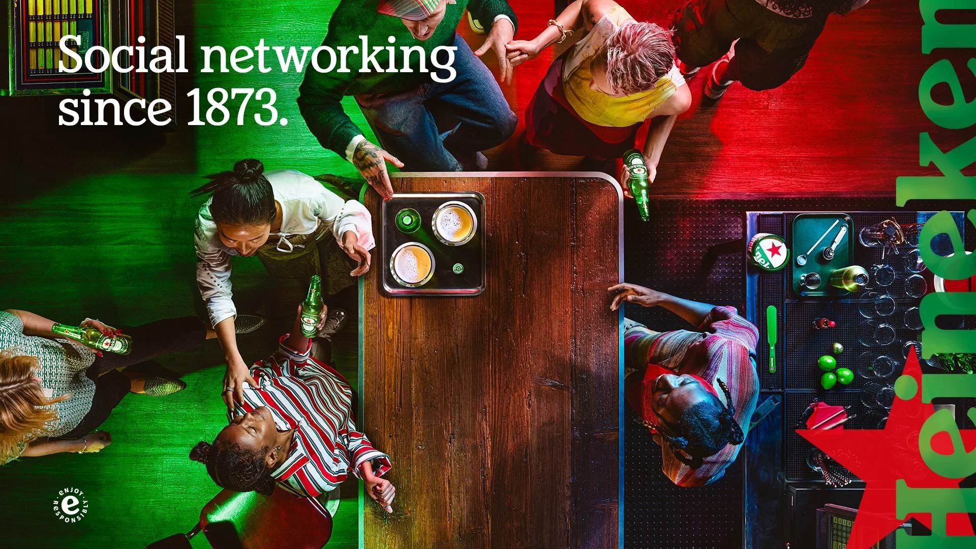 La campaña no se limita a redes o televisión. Se extiende a experiencias físicas en bares, gráficas con frases como “Social networking since 1873”, y escenarios que convierten mesas en gigantes smartphones —un guiño visual que invita a soltar el dispositivo y mirar al otro.
